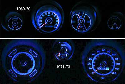 One of the most common problems with vintage Mustangs is trying to read the dimly lit instrument panel, especially at night. The old OEM incandescent bulbs simply don't illuminate very well. This new LED replacement bulb kit will remedy the problem while offering a sportier style to your instrument panel with colored LED bulbs. Included in this kit for 1969-73 Mustangs are (9) colored LED bulbs (1) white high beam bulb, and (2) white turn signal indicator bulbs.
