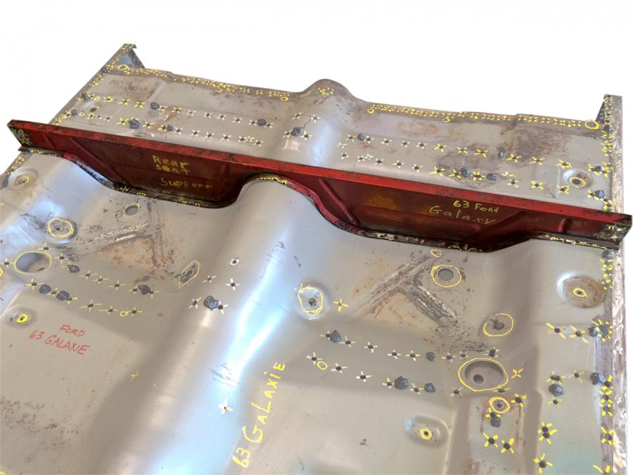 Reproduction rear seat riser / support for the 1963 Ford Galaxie. This piece attaches to the rear of the floor pan providing a riser / landing point for the back seat. Correct for all hardtop models, can be used on convertible models with modification.