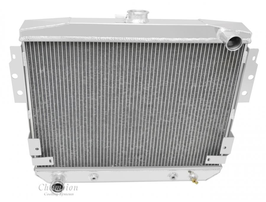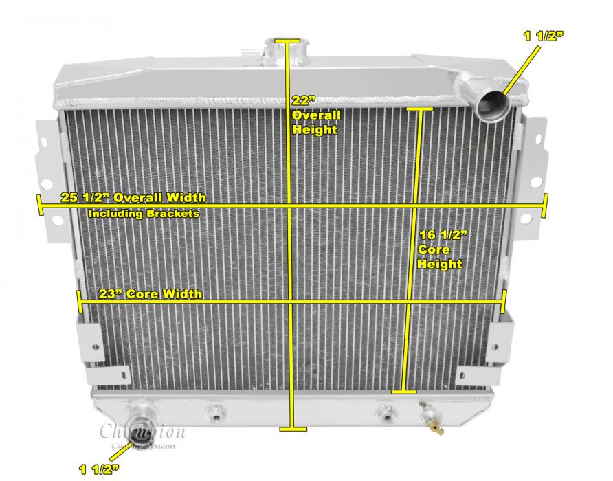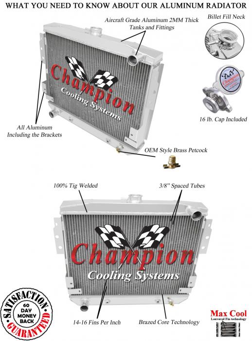 Our Champion Pro series radiators are designed to cool your high performance engine and to keep you and your car on the road. The Champion Pro series is designed using 11/16” tubes. These radiators are built with three rows of tubes, brazed aluminum cores which are tig-welded to aluminum tanks. All have approximately 14-16 louvered fins per inch, a brass petcock, and all are designed with aircraft grade aluminum. The strength of the aluminum allows for the improved design of larger tubes which allows a lightweight more affordable aluminum radiator to outperform a copper-brass radiator of similar dimensions. These radiators are typically 30-40% more efficient than their copper-brass equivalent. We would recommend one of these radiators for vehicles applications with 800 horsepower or less.
