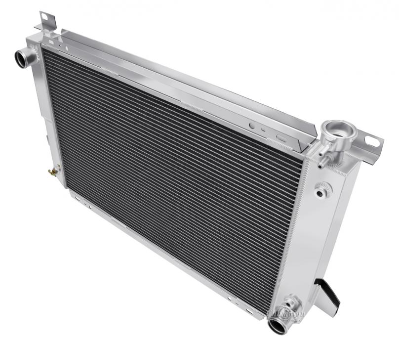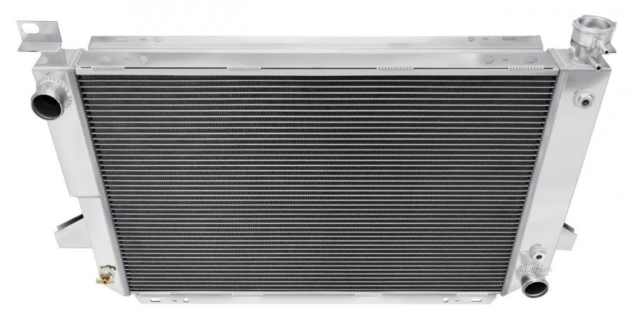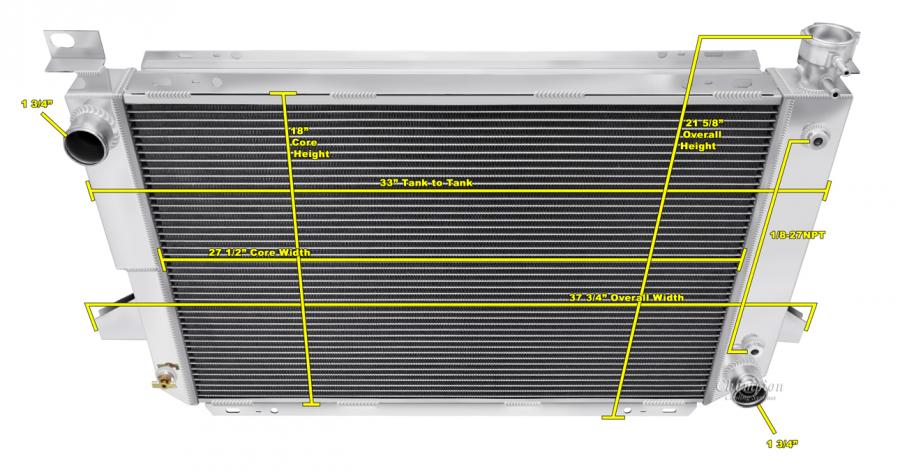Our Champion Pro series radiators are designed to cool your high performance engine and to keep you and your car on the road. The Champion Pro series is designed using 11/16” tubes. These radiators are built with three rows of tubes, brazed aluminum cores which are tig-welded to aluminum tanks. All have approximately 14-16 louvered fins per inch, a brass petcock, and all are designed with aircraft grade aluminum. The strength of the aluminum allows for the improved design of larger tubes which allows a lightweight more affordable aluminum radiator to outperform a copper-brass radiator of similar dimensions. These radiators are typically 30-40% more efficient than their copper-brass equivalent. We would recommend one of these radiators for vehicles applications with 800 horsepower or less.