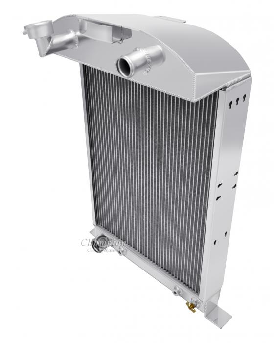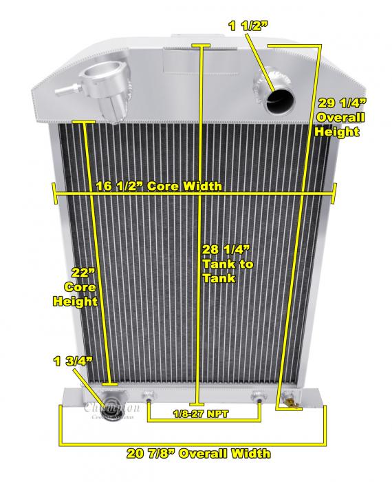 Our Champion Pro series radiators are designed to cool your high performance engine and to keep you and your car on the road. The Champion Pro series is designed using 11/16” tubes. These radiators are built with three rows of tubes, brazed aluminum cores which are tig-welded to aluminum tanks. All have approximately 14-16 louvered fins per inch, a brass petcock, and all are designed with aircraft grade aluminum. The strength of the aluminum allows for the improved design of larger tubes which allows a lightweight more affordable aluminum radiator to outperform a copper-brass radiator of similar dimensions. These radiators are typically 30-40% more efficient than their copper-brass equivalent. We would recommend one of these radiators for vehicles applications with 800 horsepower or less.