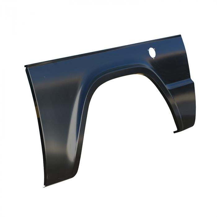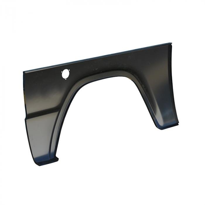 This driver (left) side lower quarter panel is stamped on new precision tooling for high durability and a precision fit. We flared it to match the front fender, giving it a great look, and allowing it to accept a larger tire than a stock quarter. We then go a step further and have it black EDP coated, inside and out, for high corrosion resistance.