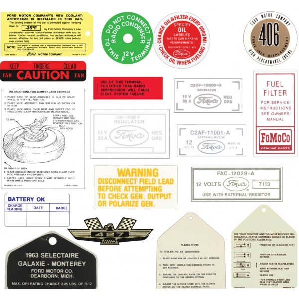 If you want all the available decals for your classic Ford and don't want to search our catalog to make a big list, we have just the kit for you, complete decal kits are now available to save you time and money. Kits have been researched for each model listed and are offered at a discounted price from individual decal purchase. We have painstakingly researched each model listed and created kits of all the available decals for your model and packaged them at a discounted price. These decal kits include correct concours quality decals in factory shapes and colors. Kit contents vary greatly depending on your model and have between eight to twenty decals depending on vehicle options and model year. Please note: some decals that are original on your car may not be available, we offer all the decals that are currently available in the kit. Most kits include the following: air cleaner decal, valve cover decals, coil decal, voltage regulator decal, generator or alternator decal, tire pressure decal, jack instruction decal, starter decal, emission decal. Please call for a specific list of the items included in your kit. There may be Other kits available in the future, please call if you do not see your model listed. Buy the Dearborn Classics decal kit and save valuable time and money!