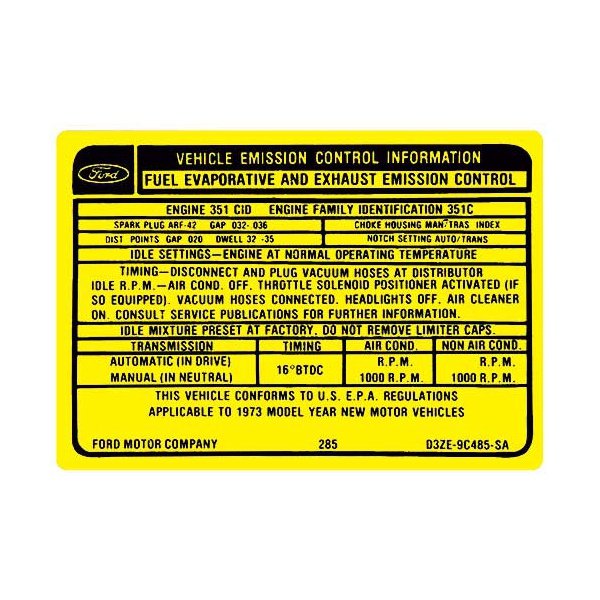 Ford Mustang Decal - Emissions - 351 4 Barrel V-8 With Manua,l Transmission