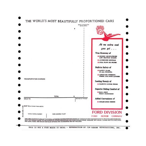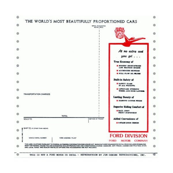 Choose from our complete selection of original engine, trunk, and interior detailing decals. All of our decals were reproduced from original Ford decals in intricate detail and feature correct shape, design, and coloring for the concours restoration. For decals not listed, please contact our sales department.