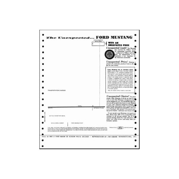 Ford Mustang New Car Window Price Sticker - Late 1964:
