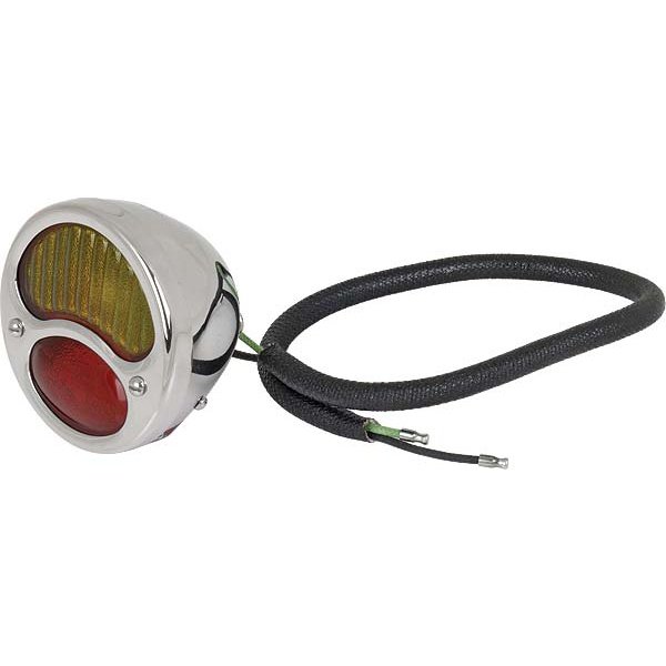A copy of the original, with a stainless steel rim and clear license lens on the bottom and amber on top. Includes 6 volt bulbs. Commercial lights were painted black.
