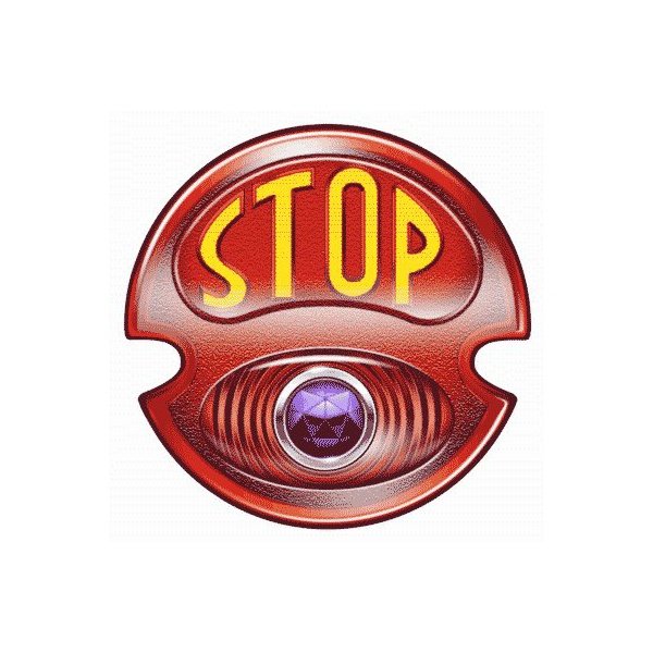 All red glass lens with amber "stop" in top portion with blue glass dot.