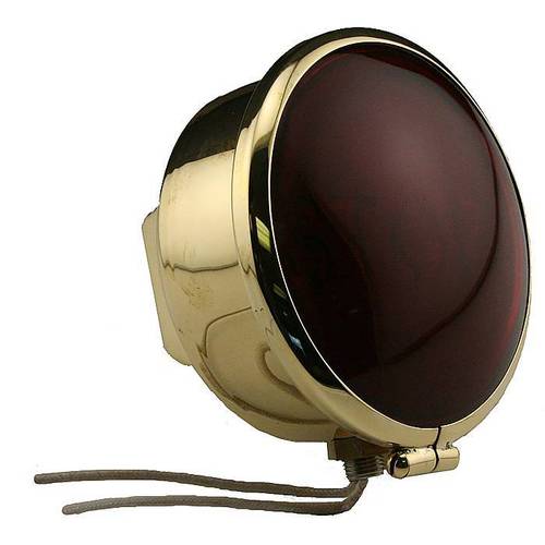 A beautifully polished brass lamp with a red lens. When illuminated, STOP will appear in the lens. U.S.A.