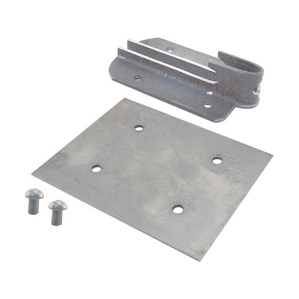 A 4 hole bracket with reinforcing pad, 2 round head rivets, and 2 oval head rivets. It holds the fender to the fender brace.