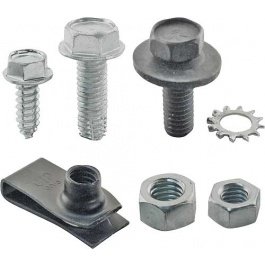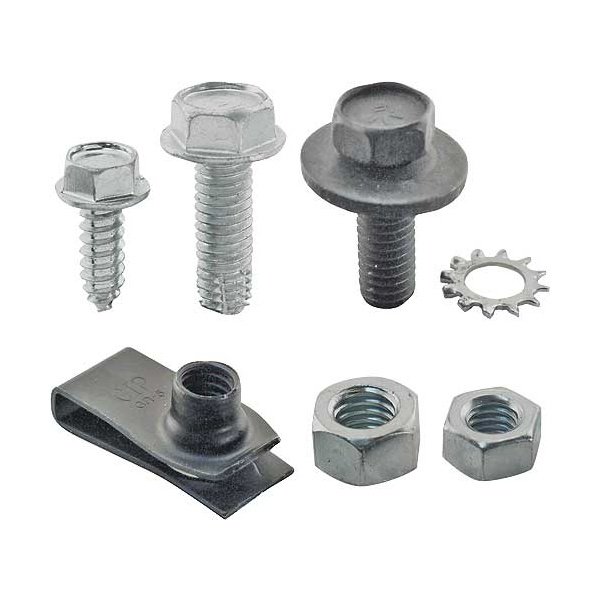 1 threaded U-nut, 1 black oxide finish hex-head bolt with captive flat washer, 1 faceted-flange-head black oxide finish bolt, 1 external-tooth lock-washer, 1 hex washer-head bolt, 1 hex washer-head screw & 2 hex nuts. 1 kit does the rear of 1 splash shield.