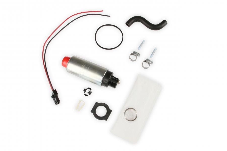 The Holley line of high output in-tank electric fuel pumps is available in flow ratings of 190 and 255 liters of fuel per hour. A 155 liter per hour Mustang pump is available along with 255 liter per hour rated pumps for "forced induction" applications. These particular pumps flow significantly more fuel at high pressure. For example, at 80 PSI the standard 255 lph pump will flow around 132 liters (35 gallons) per hour. At the same 80 PSI the equivalent forced induction pump will flow over 210 liters (50 gallons) per hour. Holley in-tank electric pumps utilize a proven geroter design. The outside dimensions, however, are compact enough to fit existing hanger assemblies, without modification. Coverage includes most popular Ford, General Motors, Chrysler and import applications. These are complete fuel pump kits and include all accessories and installation instructions. Also includes is an inlet filter that meets or exceeds original equipment specifications and provides improved filtration and durability.