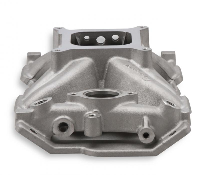 The new single plane intake manifold is designed to provide a broad RPM powerband for high-performance street/strip engine applications to a maximum engine speed of 7500 RPM. The carburetor-mounting pad is designed to accept all stock or aftermarket square-bore carburetors with manual or electric chokes. These intake manifolds are designed to accept most stock hardware and accessory brackets, but offer performance features; like an updated plenum divider area, a 1" shorter height than the 300-25 manifold, and a choice of two distributor clamp locations. The isolated design of the air/fuel passages helps to increase charge air density and performance. The 300-261 intake manifolds are designed for square-bore carburetor applications on 1957-86 262-400cid Small Block Chevrolet engines and SBC engines equipped with 1987-91 L98 aluminum Corvette cylinder heads (non-EGR applications). Also, these manifolds will work with any SBC engine equipped with aftermarket cylinder heads, as long as they have a standard port flange opening and mounting bolt locations.