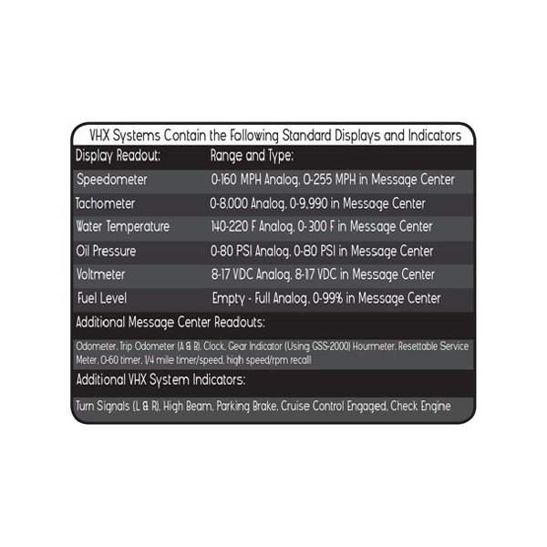 Modern Digital style Add-On Message Center, LCD Readout and gauge face to match a VHX Instrument System. Modules must be used with a VHX Instrument System. Not compatible with VFD3 or individual gauge systems, nor as a standalone gauge.