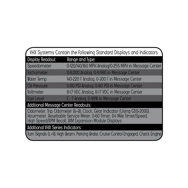 Fully lit needles, backlit faces, and highly visible LCD message centers are a few of the things that you can see which set the VHX Series apart from yesterday's traditional approach to instrumentation. A few of the features which you don't normally see are the micro-controlled precision stepper motors, solid state sensors for unparalleled accuracy, and user-customizable display feedback. Completely engineered and manufactured at our facility in Sioux Falls, South Dakota, the VHX Series has completely revolutionized the instrumentation industry!