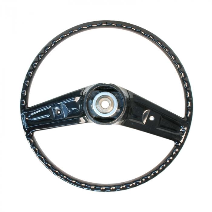 Our black two spoke steering wheel is a molded plastic design with textured features. It features a tig welded inner frame and a CNC machined center hub for an optimal restoration. We make this steering wheel in the USA on brand new precision tooling, which enables this reproduction to be an exact copy of the original. This part has an outside diameter of 16½" and a overall depth of 7", weighing 6 Lbs.