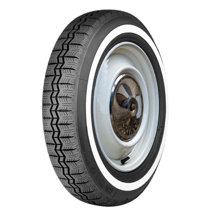 This product features a genuine narrow whitewall sidewall style. This means that the bright white rubber is added directly to the tire sidewall during initial construction of the carcass, resulting in a truly integrated, high-quality product after vulcanization. When we reference "narrow whitewall" tires, we typically mean a whitewall that measures less than two inches, but it can also mean a whitewall that does not reach all the way into the bead. Narrow whitewall tires are popular for many cars built in 1960's all the way into the 1990's.