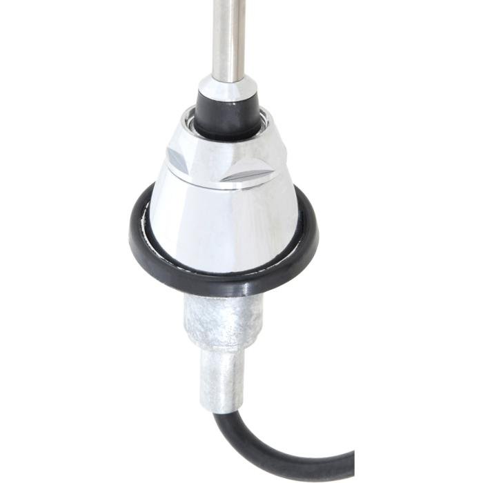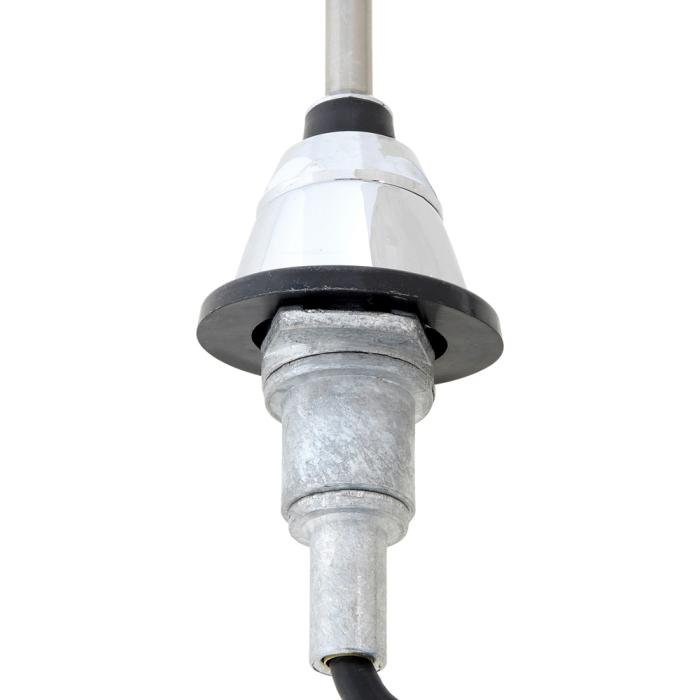 Reproduction radio antenna with round base for 1964-68 Mustang and other models with telescopic mast. This authentic reproduction includes the antenna, installation hardware, cable, and gasket.