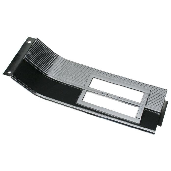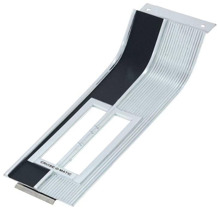 Beautiful authentic reproduction of the original console shifter plate unit manufactured to original factory specifications. This zinc die-cast panel is chrome plated including a black camera case textured finish same as original. This plate is the small upper portion of the console trim. Includes correct ribbin on passenger side as shown. Installed on Mustangs with automatic transmissions.