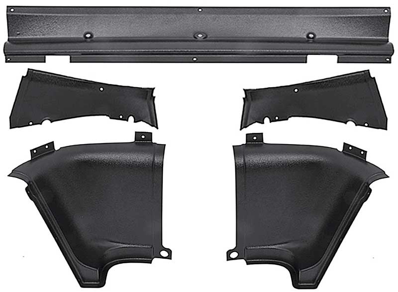 Now you can complete your rear interior restoration with this quality reproduced 1965-66 Mustang Fastback upper and lower interior quarter trim corner panel set. Each 5-piece set includes the rear upper and lower trim panels for both the driver and passenger side as well as the trap door trim piece. Replaces the interior trim panels around your Mustang Fastback's rear fold-down seat area. Each panel set features the correct grain molded into the heavy duty injection molded plastic panel just like the factory original trim panel. Hardware screws are not included in the set.