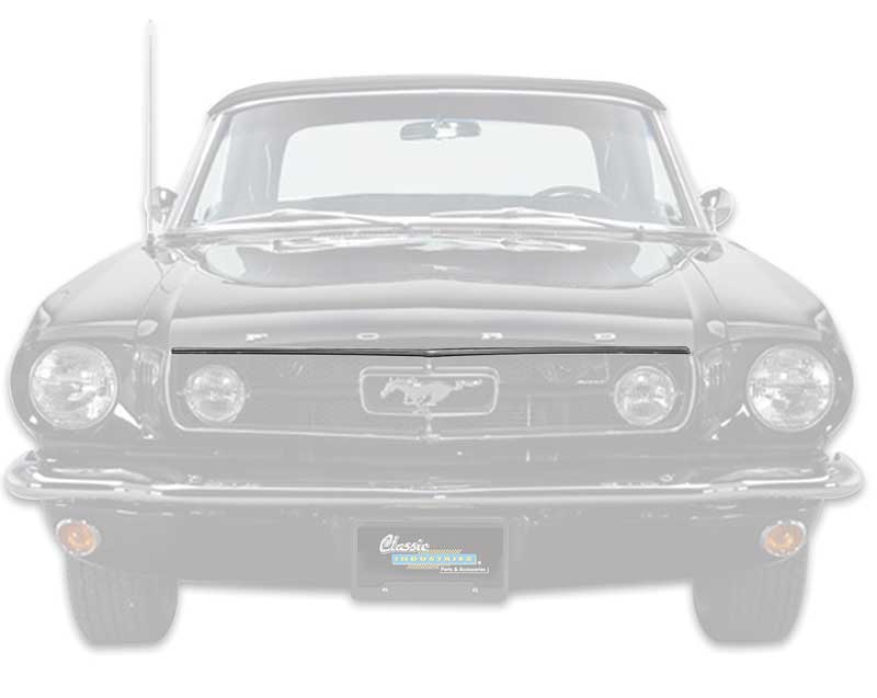 Reproduction hood lip molding for 1964-66 Mustang. Mounts on the edge of the hood above the grille. Produced in highly polished stamped aluminum as original, this finely crafted hood lip molding adds the finishing touch to your Mustang restoration. Includes mounting hardware. Note: For use with late production 1964-1/2 models.