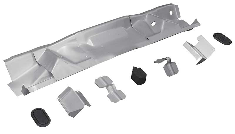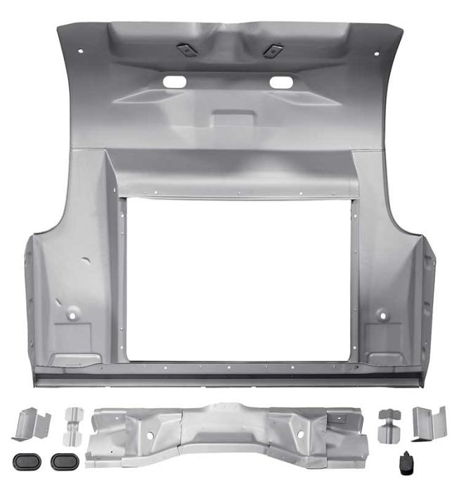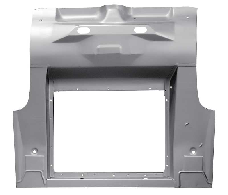 This is the full reproduction stamped steel floor pan assembly to fit 1964-70 Mustang Convertible in Weld-Thru primer. The main structural part begins at the rear seat divider and goes back towards the taillight panel. Included is the trunk floor extensions and the inner trunk brackets. There is also a panel where the pinion snubber attaches. The opening is where the fuel tank sits.