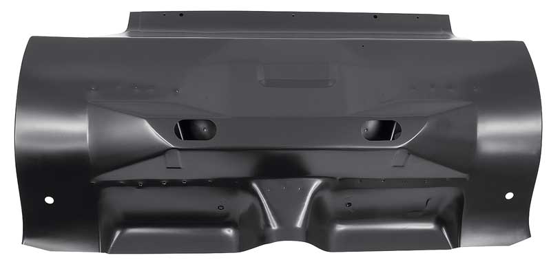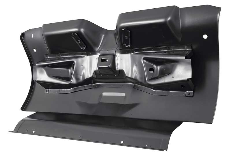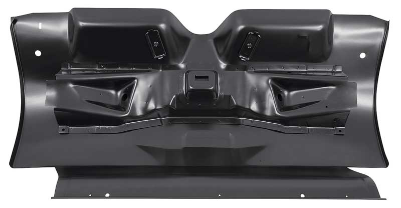 Reproduction of the original rear transition panel manufactured with OE gauge steel and produced with the exact original specifications for a proper fit and function. This metal floor pan runs from the rear of the back seat to the trunk panel. Each stamped steel panel comes finished in EDP coating with shock mounts included. Fits 1964-70 Mustang coupe, Fastback, convertible, and 1967-70 Cougar coupe, 1969-70 Cougar convertible.