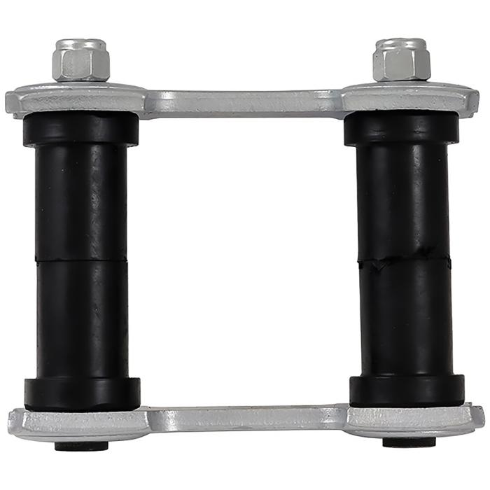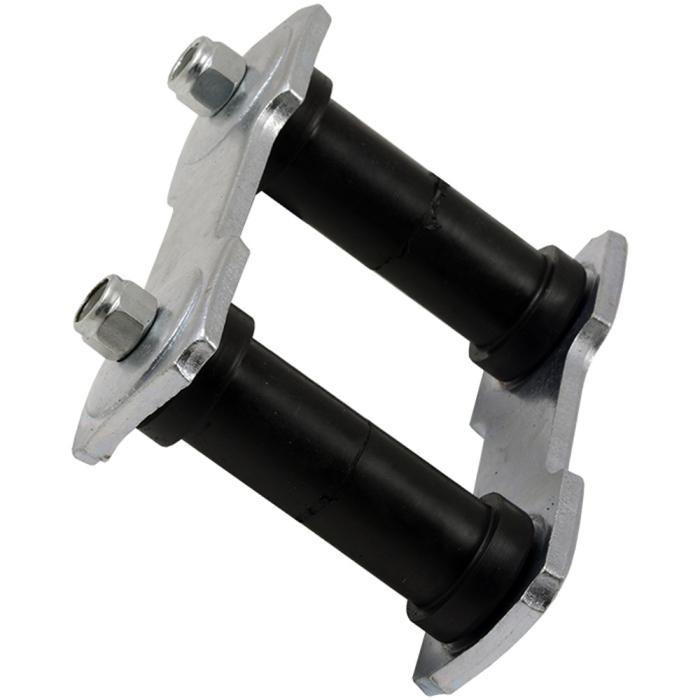 Reproduction rear leaf spring shackle designed for the rearward eyelet of the leaf spring on various 1966-71 Ford and Mercury models including Torino, Ranchero, Comet, and Falcon Wagons. This rear shackle kit includes 2 shackle bars, 4 rubber bushings, 1 shackle bar plate, and 2 retaining nuts. Sold per side. 2 shackles per vehicle required. Replaces Ford part number # C60Z-5630-A.