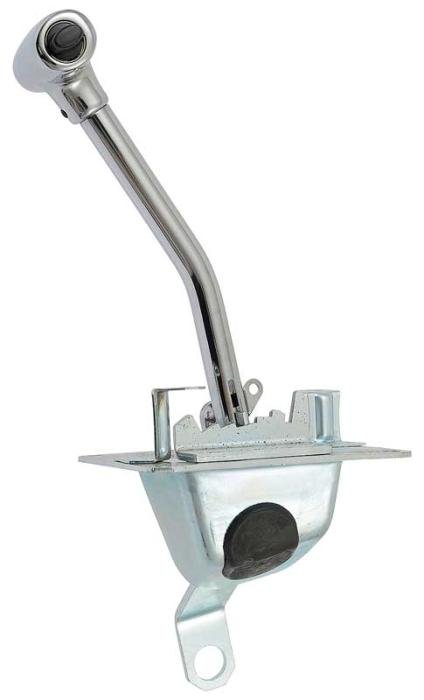Reproduction of the original Shifter Assembly for use with 1967-68 Mustang and Cougar models equipped with and automatic transmission and factory floor console. Each Shifter Assembly is constructed in stamped steel with quality chrome plating on the lever and handle just like the factory original. Made to OE specifications, this shifter assembly is a direct-fit for bolt-on installation.