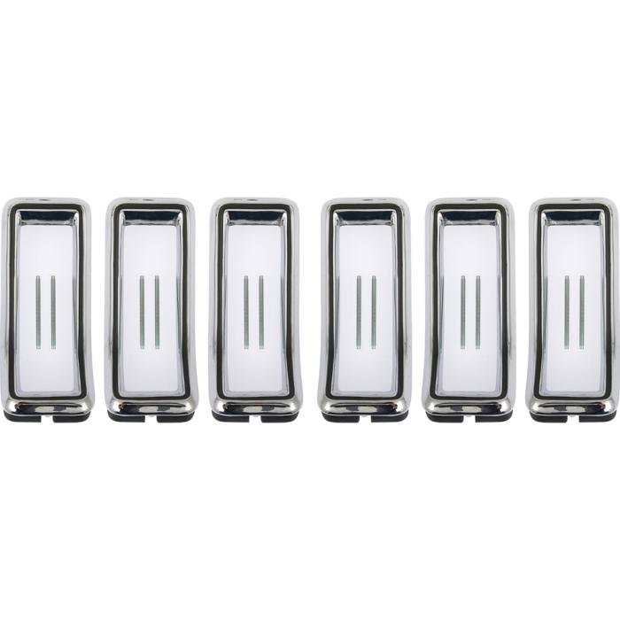 Reproduction of the original tail lamp lens bezels designed for use on 1968 Mustangs. Mustangs used 3 tail lamp bezels per side, and they look almost identical to 1967 units except for the black painted detailing around the front surface of each bezel. This popular OER reproduction features the authentic black painted details, a brilliant chrome plated finish and accurate dimensions, contours and mounting points. Each kit includes 6 bezels, 6 heavy rubber tail lamp panel seals, and 12 mounting studs; enough for RH and LH tail lamps.