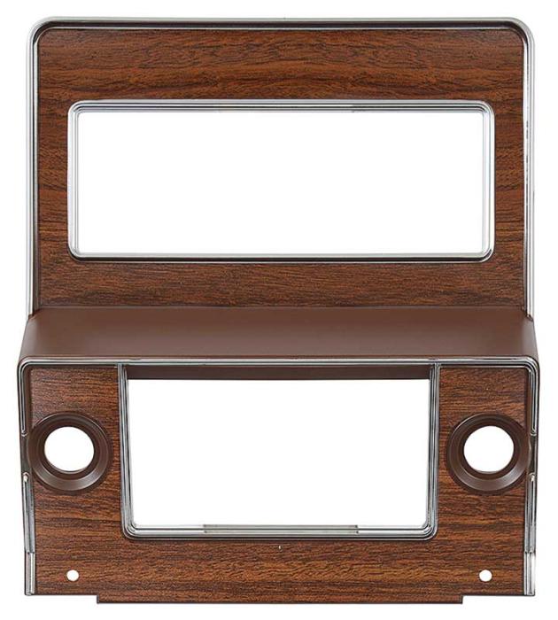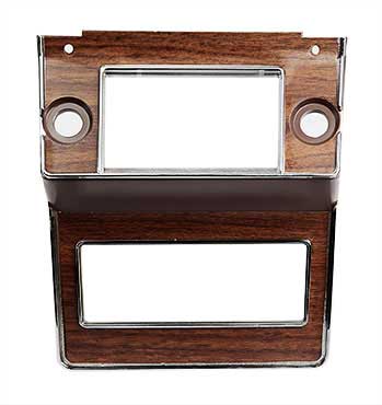 Reproduction of the original style woodgrain radio control bezel designed for use with 1969-70 Mustangs with the deluxe interior, or Mach 1 package. Features authentic dimensions and molding with accurate openings for radio nose piece, knobs and the ventilation controls in the lower part of the bezel. Features a bright trim with tan camera case painted surfaces to compliment the rich woodgrain surface treatment.