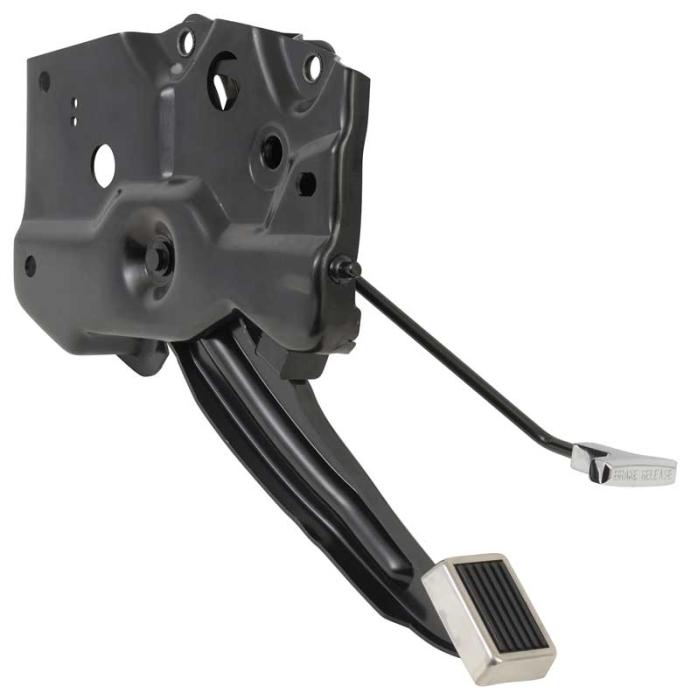 Reproduction of the original parking brake assembly for use with 1969 Mustang and Cougar models. Complete parking brake assembly with foot operated arm and release mechanism. The parking brake assembly is mounted under the dash. Includes the foot pedal and a custom pedal pad as well as the hand release lever and handle. For use with Fastback, coupe and convertible models.