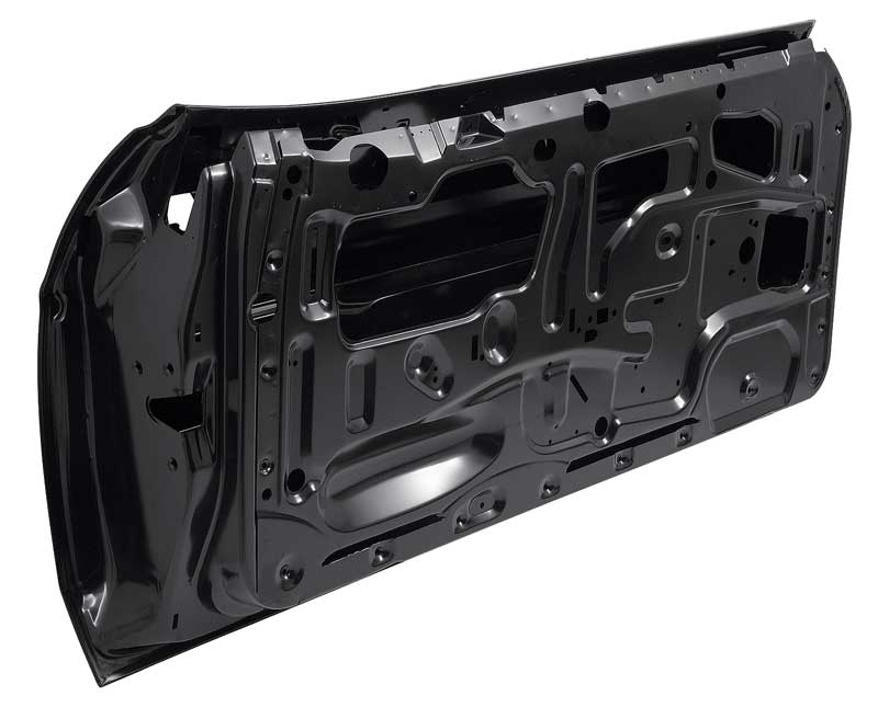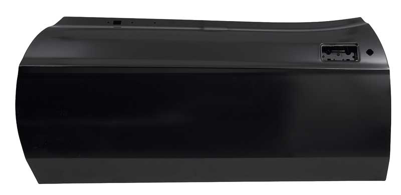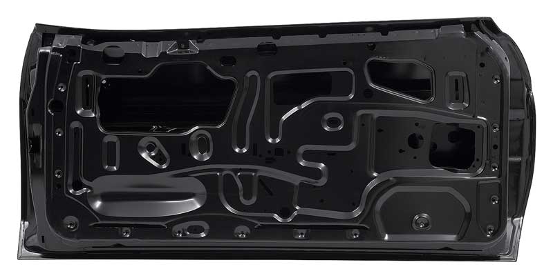 Reproduction of the original style full door shell designed for use with 1971-73 Ford Mustang models. Each outer door shell is manufactured from stamped steel to original factory specifications, featuring correct contours for an authentic appearance and proper fit. All mounting hole locations are accurately reproduced for window and door latch mechanisms, door hinges, and interior door panels. This reproduction door shell is intended as a replacement for the sheet metal portion only.