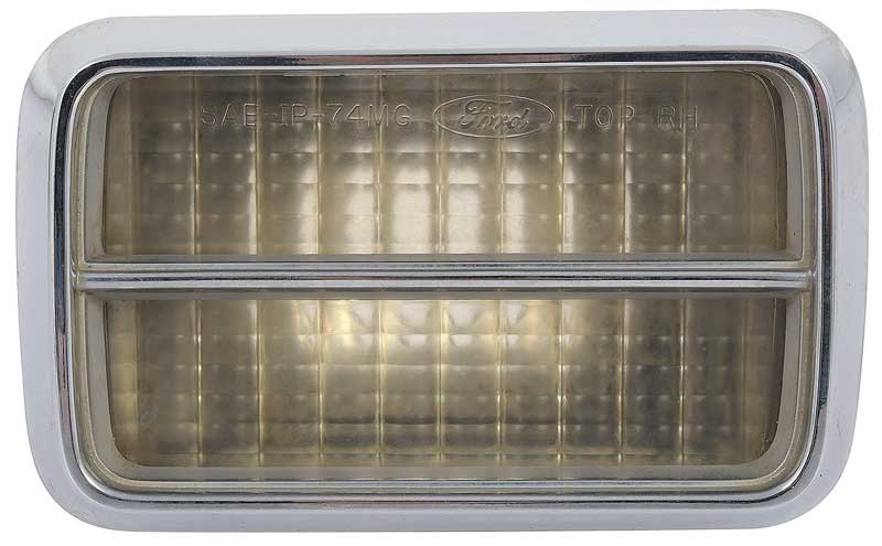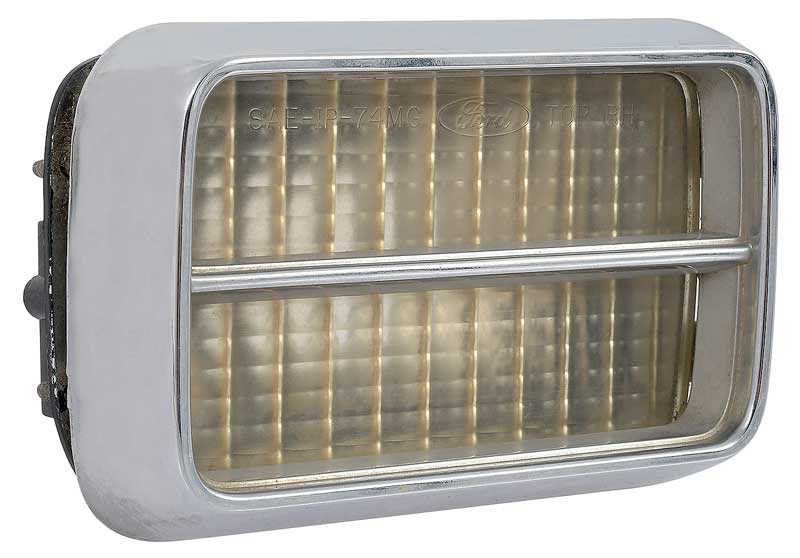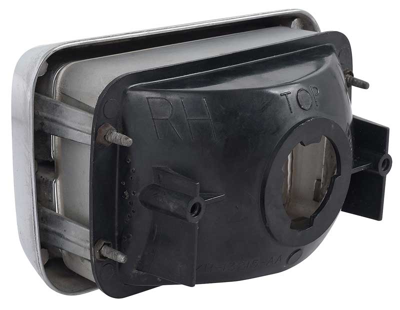 Reproduction of the original park lamp assembly for 1974 Mustang II models. Each park lamp assembly is manufactured to original factory specifications replicating the original in every detail. Each park lamp comes assembled including the lens and chrome door (bezel). For RH passenger side.