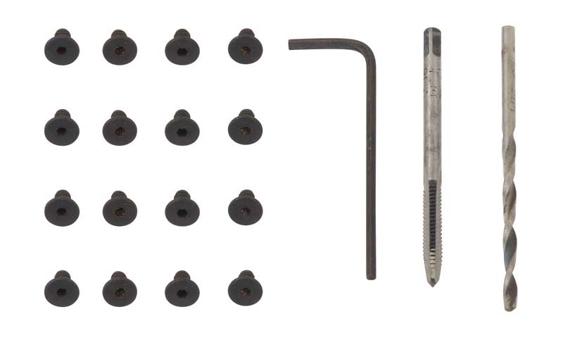 Aluminum racing pedal set for 1979-04 Ford Mustang models equipped with a manual transmission. Accelerator pedal measures 2-3/8" x 5-3/8"; brake and clutch pedals measure 2-1/2" x 3-1/2"; foot rest pedal measures 2-1/4" x 5". Includes drill bit, thread cutting tap, hex screws, and allen wrench. Made in USA with high quality 1/8" aluminum.