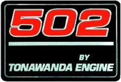 Reproductions 502 valve cover decals that includes the engine size as shown along with "By Tonawanda Engine".