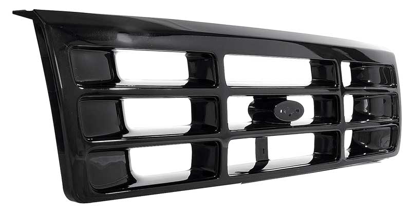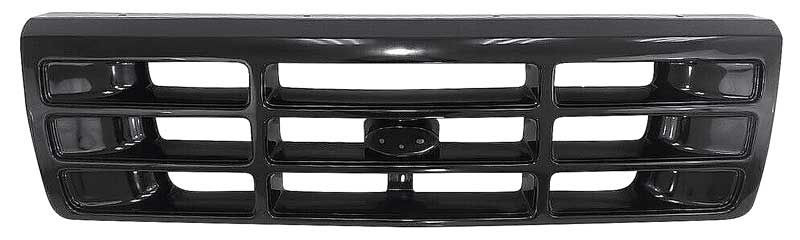 Reproduction front grill for 1992-96 Ford F150, F250, F350, and Bronco models. Each grill is manufactured in injection molded ABS to factory specifications replicating the original in quality and fitment. Features a black finish. Must re-use original Ford emblem or purchase a replacement emblem sold separately. Replaces OE # F2TZ-8200C or F4TZ-8200-H.