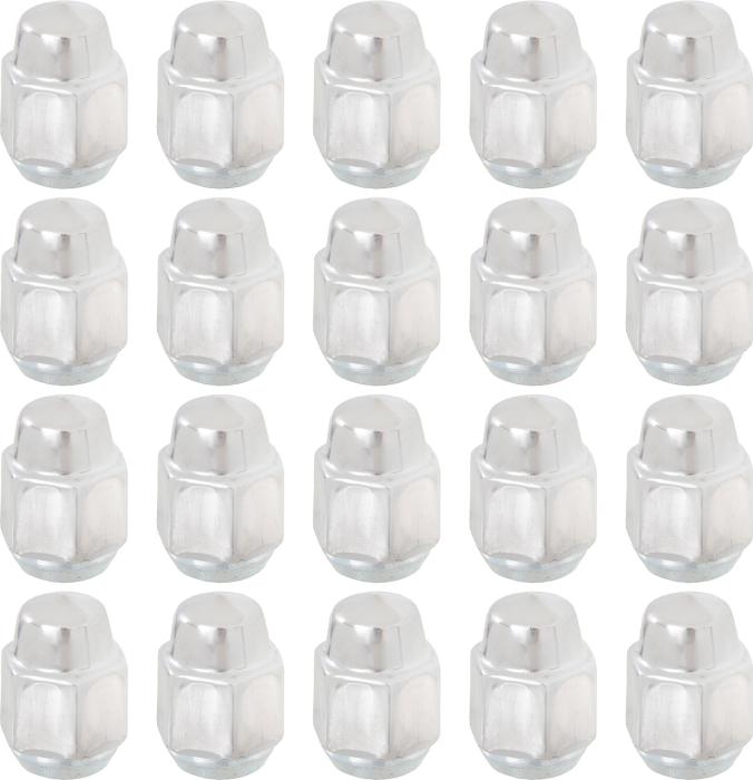 Reproduction low crown acorn lug nuts used with all 1967-81 Pontiac Rally I wheels, Rally II or Honeycomb wheels. Also used with 1969-70 Chevrolet SS Style and 1970-81 Z28 5-Spoke wheel as well as Magnum 500 wheels and other popular wheels of the era. The design of the nut is the same as the original with a stainless cap over steel nut construction. Note: This lug nut can be used for virtually any steel wheel that did not require a hub cap for the models listed below. 20 piece set.