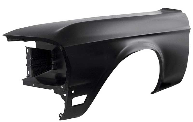 Reproduction front fender for 1968 Ford Mustang models. Each front fender is manufactured in stamped steel to original factory specifications featuring correct contours for an authentic appearance and fit. Comes with a black EDP coating for rust and corrosion prevention.