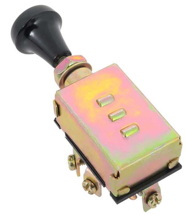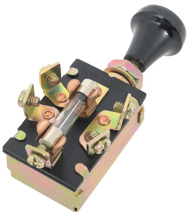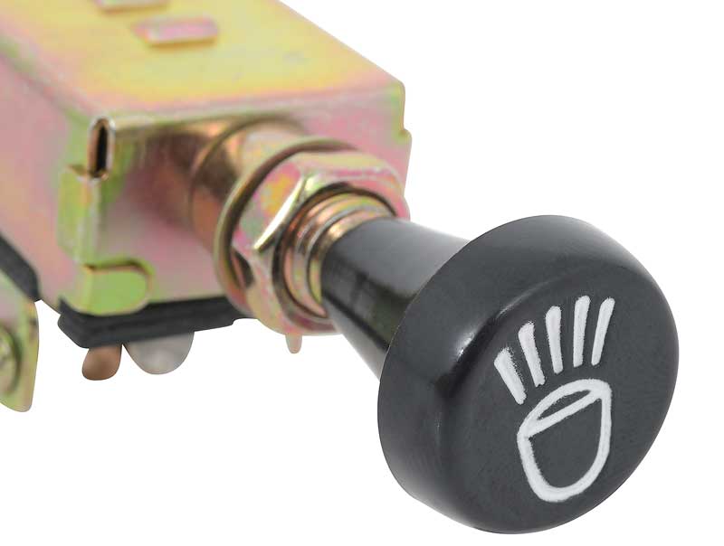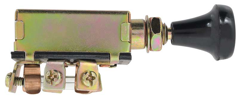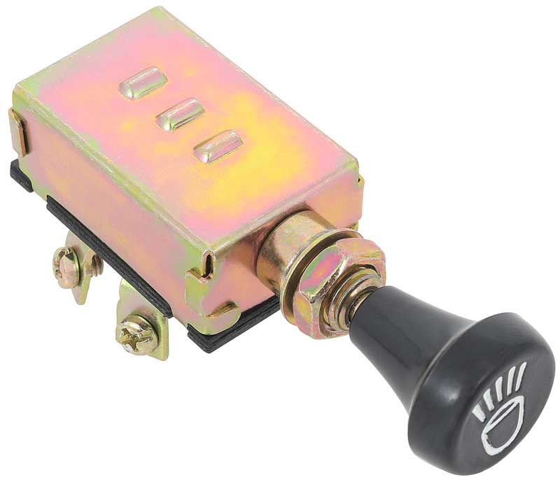 Universal fit headlamp switch for a wide variety of vehicle applications from the 1940's and beyond. Each switch features 3 position push/pull functionality with knob and shaft. Required a 3/8 diameter hole for mounting, and comes with nut and escutcheon. Has a 30 amp fuse that will work with 6 volt or 12 volt systems. This is a perfect switch for wiring into an early car, truck, rat rod, or hot rod. Has 5 terminals with it's early style knob. Headlamp Switch Specifications: