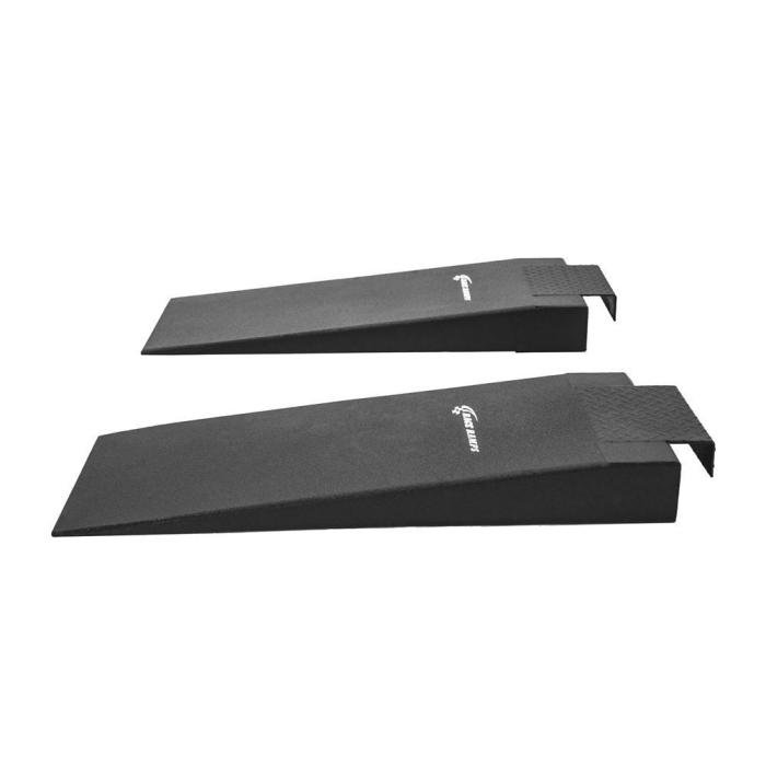 They have a 6.4-degree approach angle and come with a 3-inch hook nose. The extra wide 20-inch width works with tires up to 18 inches wide. Each rack ramp weighs 15 pounds, and can support up to 1,500 pounds for a total vehicle weight capacity of 6,000 pounds. They provide 5 inches of lift height.